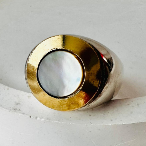 Anillo Demy, de plata, oro con centro en nácar, Su gran tamaño es imponente sin pasar desapercibido.